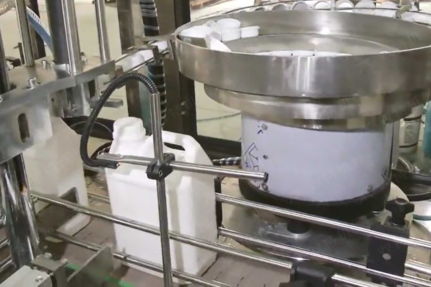 旋盖机主要用于玻璃广口瓶的三、四、六铁盖真空旋盖,用两根不同速度的皮带压瓶盖,因两根皮带的速度不同,对盖进行搓盖收紧达到旋盖目的。在自动上盖之前对瓶口吹蒸汽加热,吹掉冷空气,换上高温蒸汽,立即旋盖,根据热胀冷缩原理,蒸汽冷下来就自然形成了瓶内真空,达到了真空旋盖的目的。自动旋盖机可以和浓酱香蕉视频免费下载、蜂蜜香蕉视频免费下载、辣椒酱香蕉视频免费下载组合在一起,形成一套全自动灌装设备,是现代调味品企业的得力帮手。